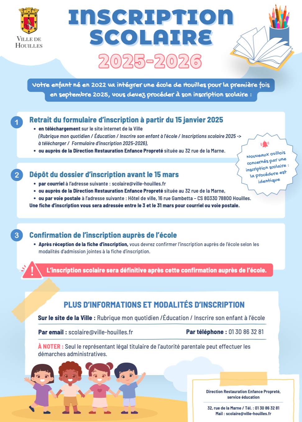 Par courriel, (scolaire@ville-houilles.fr), par courrier (Hôtel de Ville, 16 rue Gambetta – CS 80330 78800 Houilles) ou auprès de la Direction de l’Éducation et de l’Enfance (DEE). Une fiche d’inscription vous sera adressée entre le 16 mars et le 17 avril 2026.